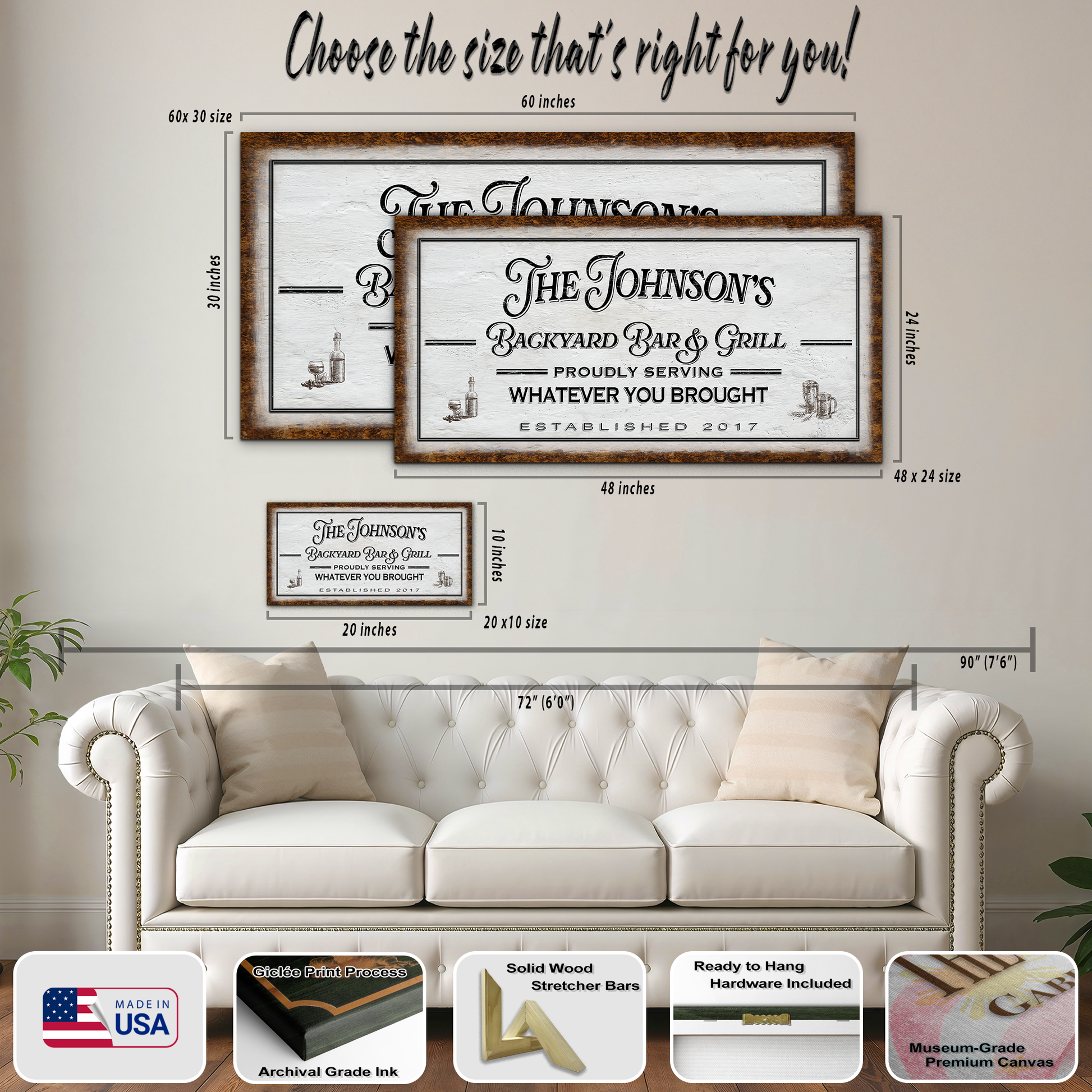 Personalization options include family name, location, and established year.