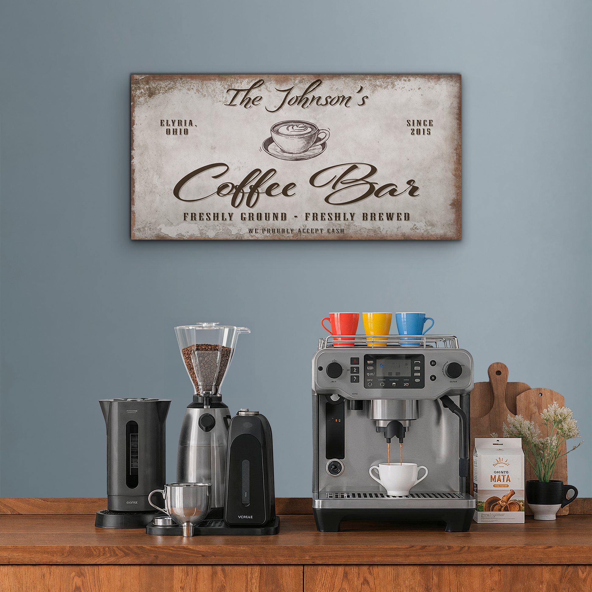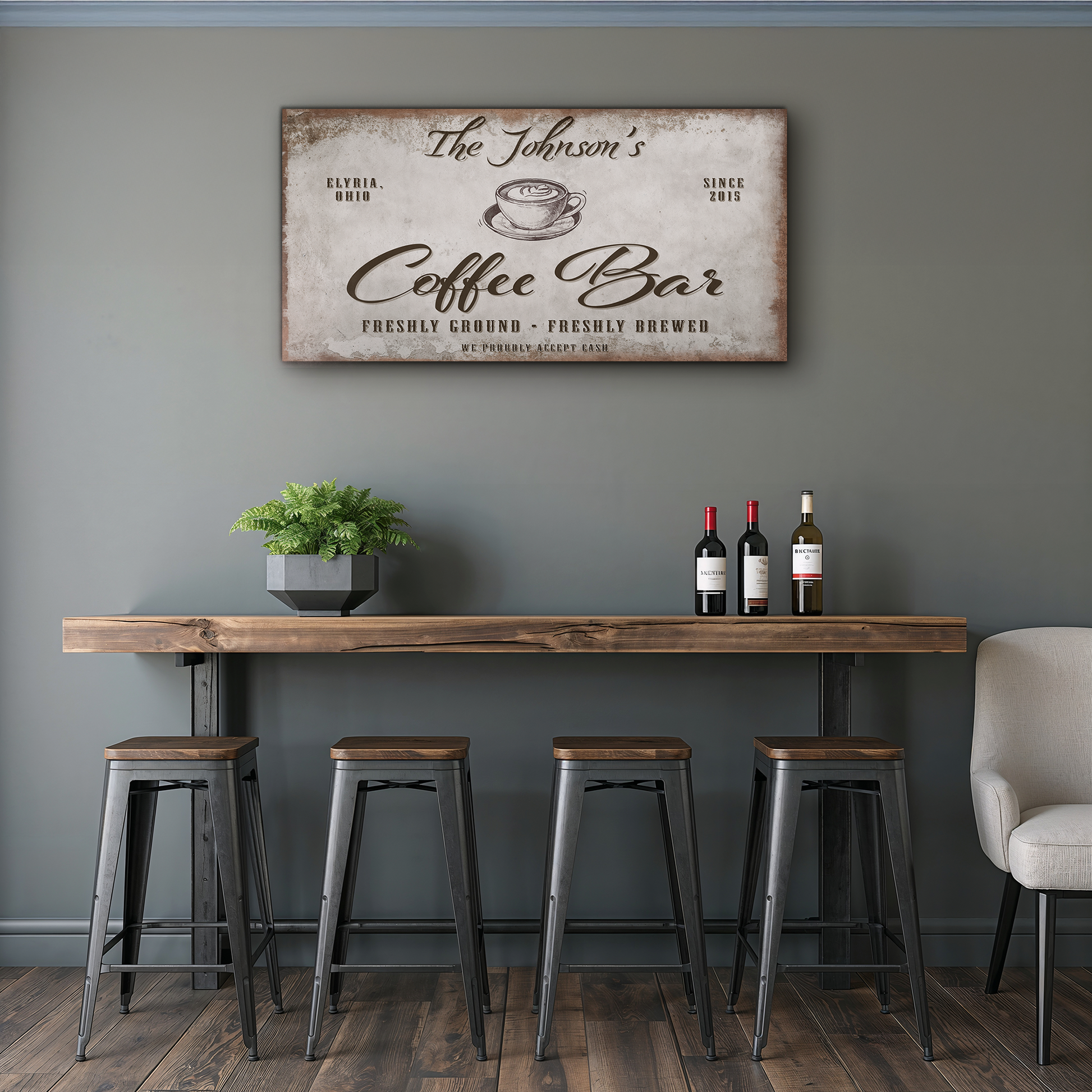 This gorgeous, Vintage Coffee Bar sign is customized with your family name, city, state, and your home's "established" year!