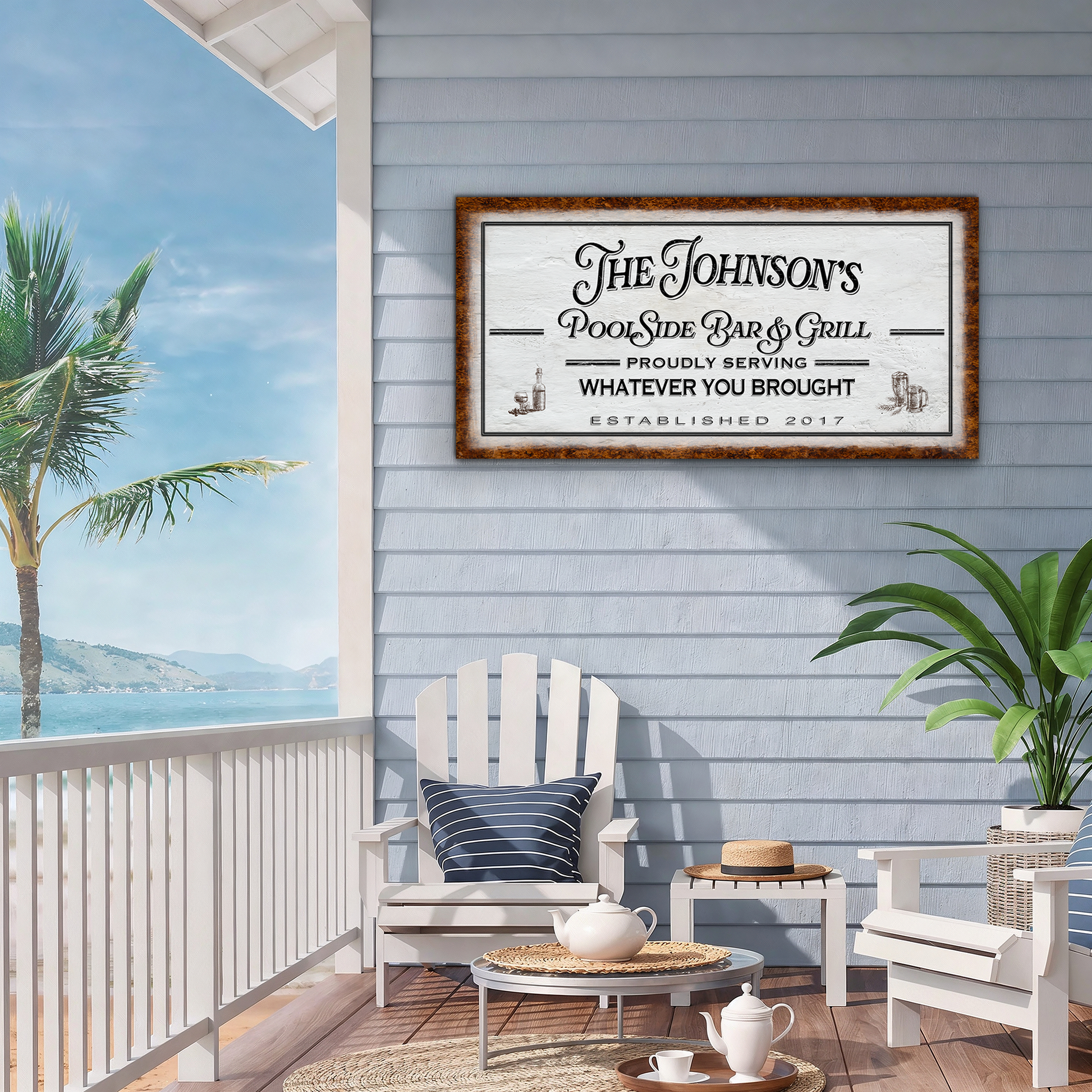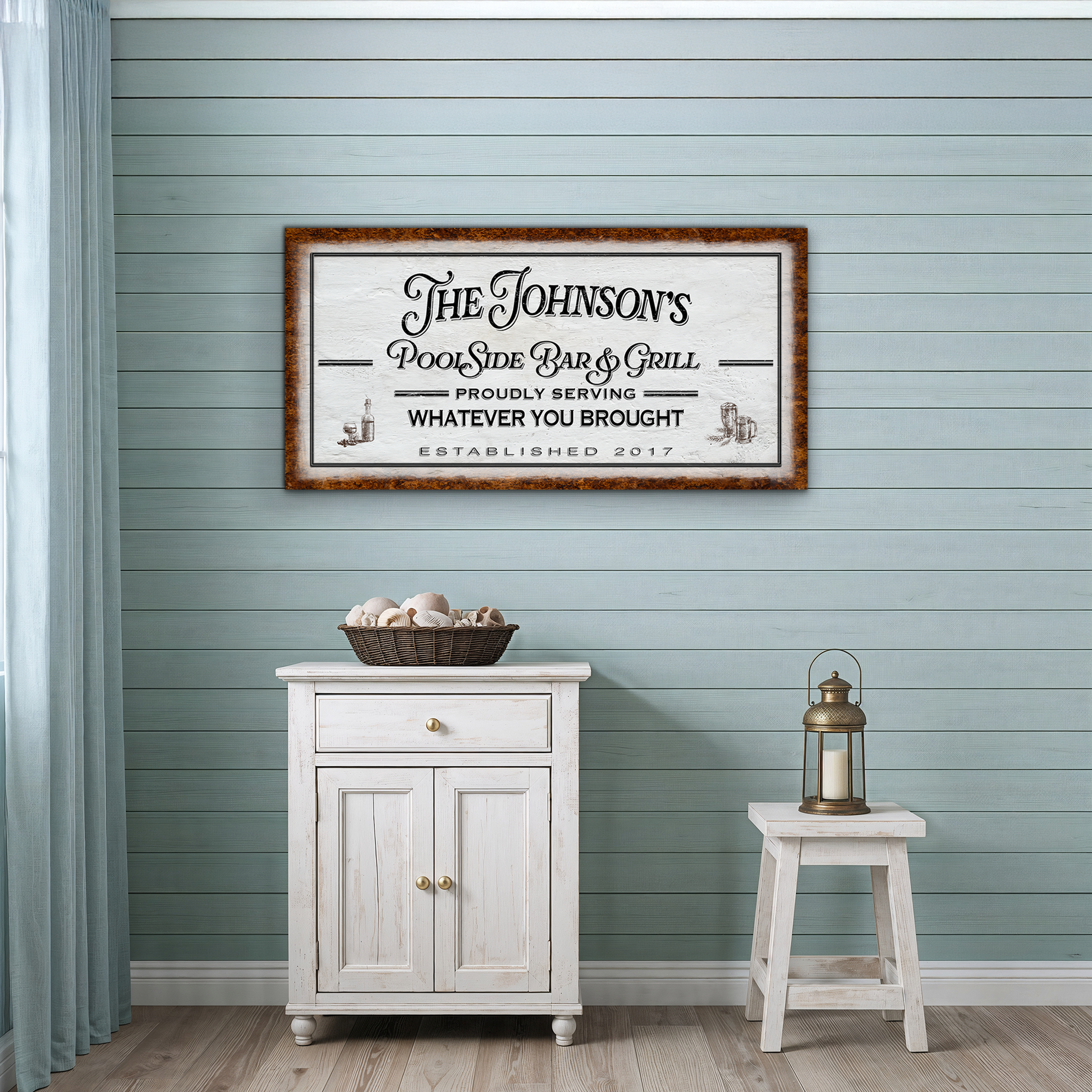Beautifully designed Poolside Bar and Grill Canvas Sign customized with your family name!